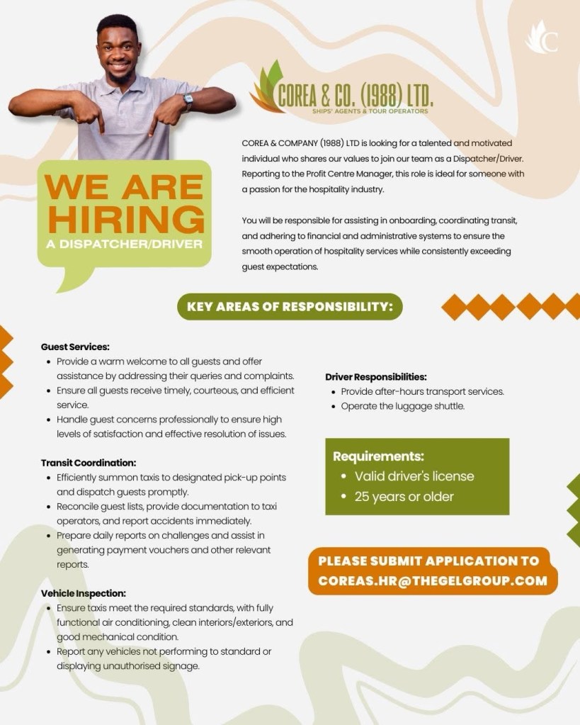 VACANCY #4: Dispatcher/Driver at Corea & Co.