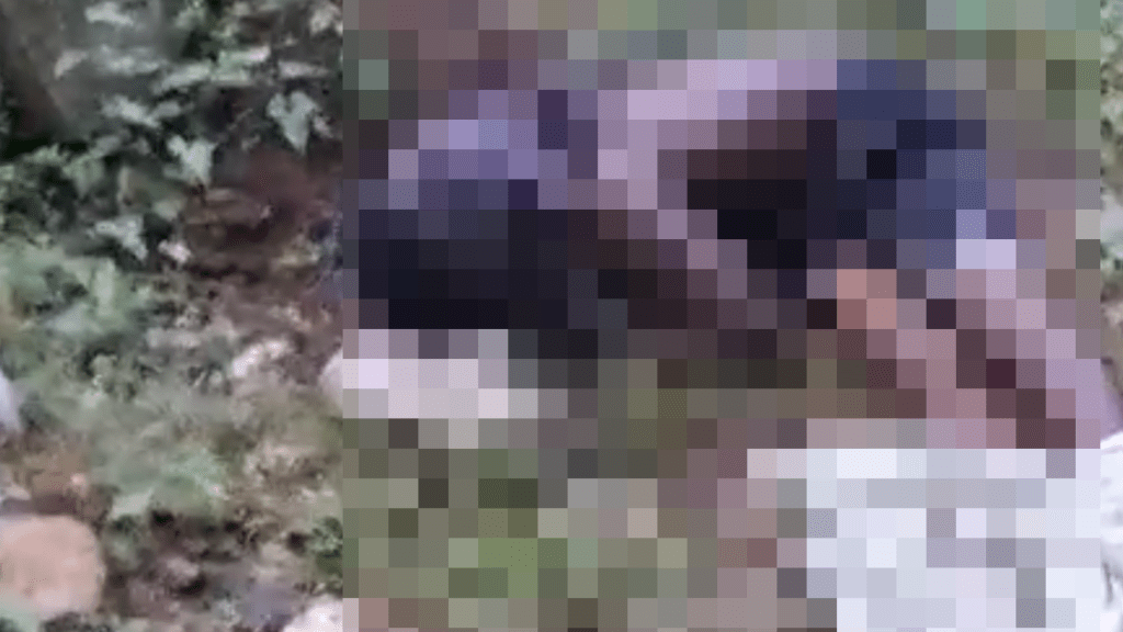In the video we obtained from villagers, a male figure is seen lying on the ground with his head covered and his feet appearing to be tied.