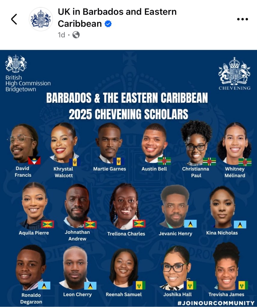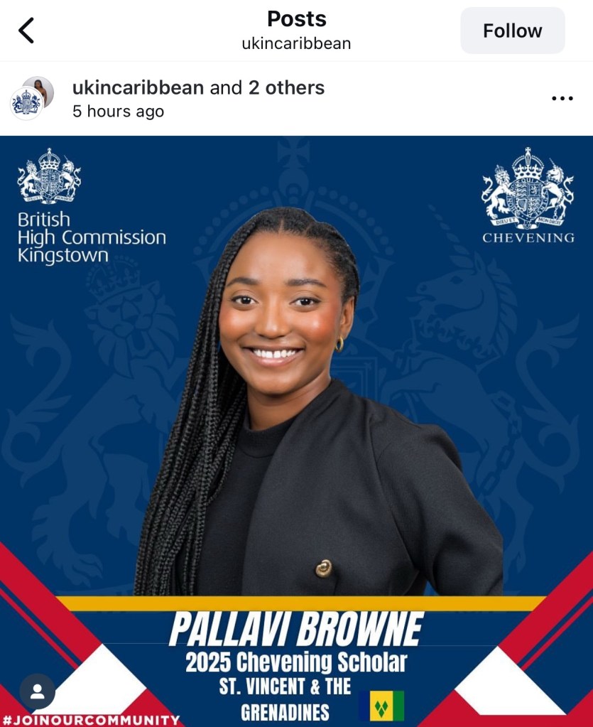 On its Instagram page, today, August 7, however, a day later, the British High Commission announced that Vincentian Pallavi Browne is a 2025 scholarship recipient.