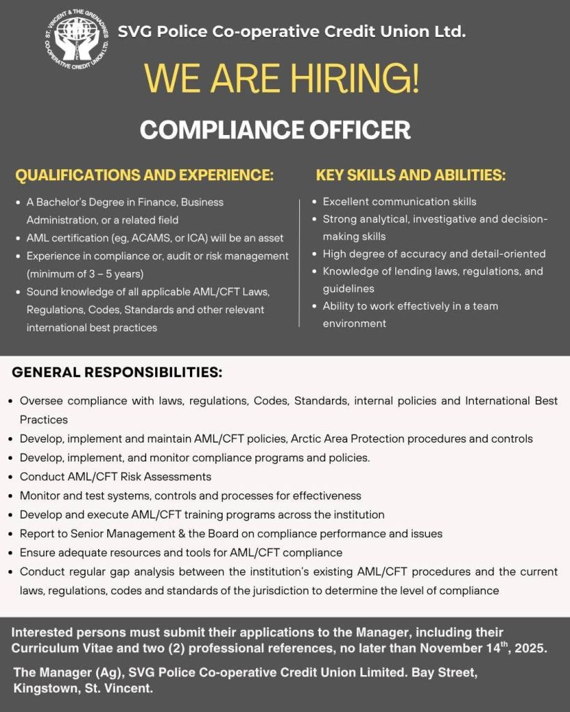 Vacancy #2: Compliance Officer (SVG Police Co-operative Credit Union Ltd.)