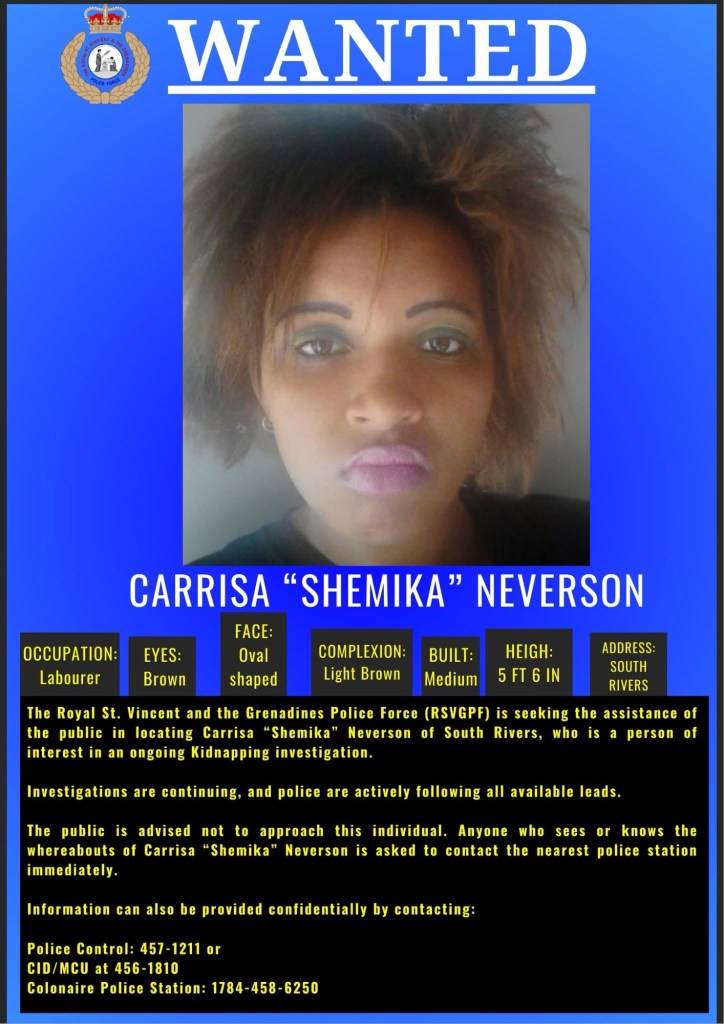 The Royal St. Vincent and the Grenadines Police Force (RSVGPF) said it is seeking the assistance of the public in locating Carrisa “Shemika” Neverson of South Rivers, who is a person of interest in an ongoing Kidnapping investigation.