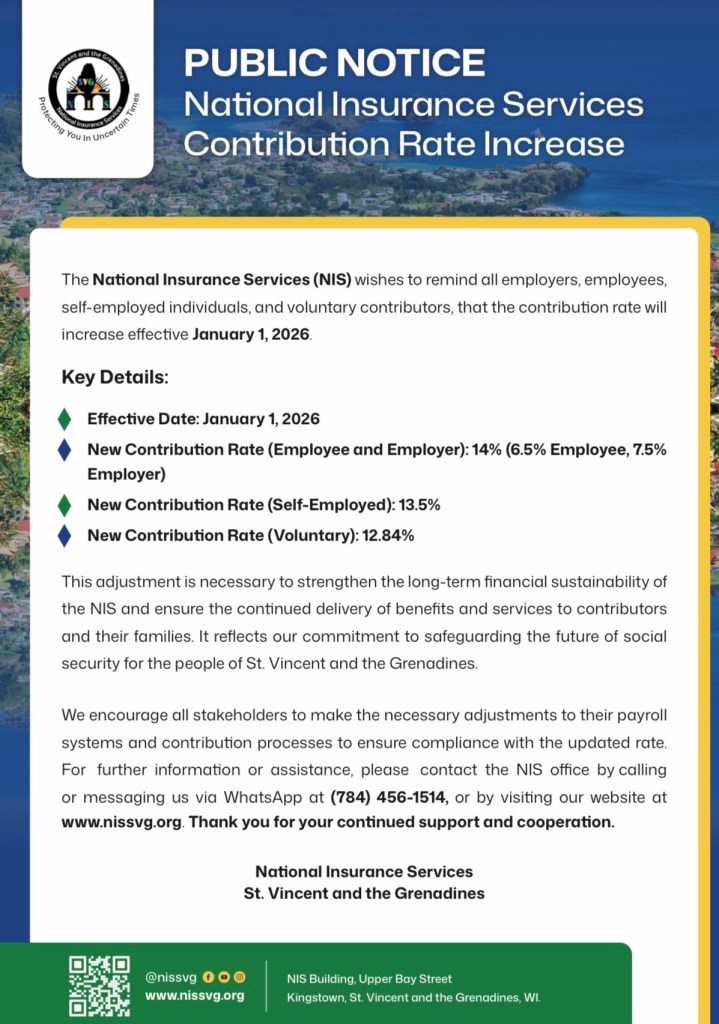 “This adjustment is necessary to strengthen the long-term financial sustainability of the NIS and ensure the continued delivery of benefits and services to contributors and their families. It reflects our commitment to safeguarding the future of social security for the people of St. Vincent and the Grenadines,” the NIS said.