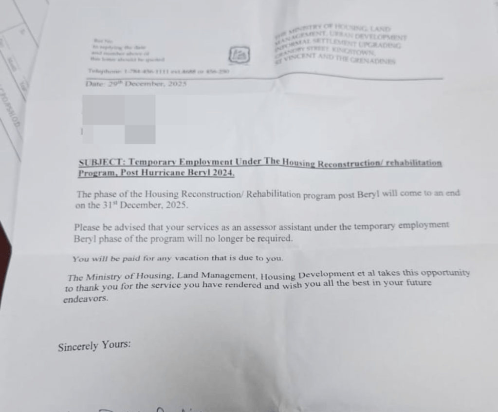 In letters obtained by One News SVG from some of the dismissed workers under The Housing Reconstruction/ rehabilitation Program, Post Hurricane Beryl 2024, the employees were told by the ministry that:
