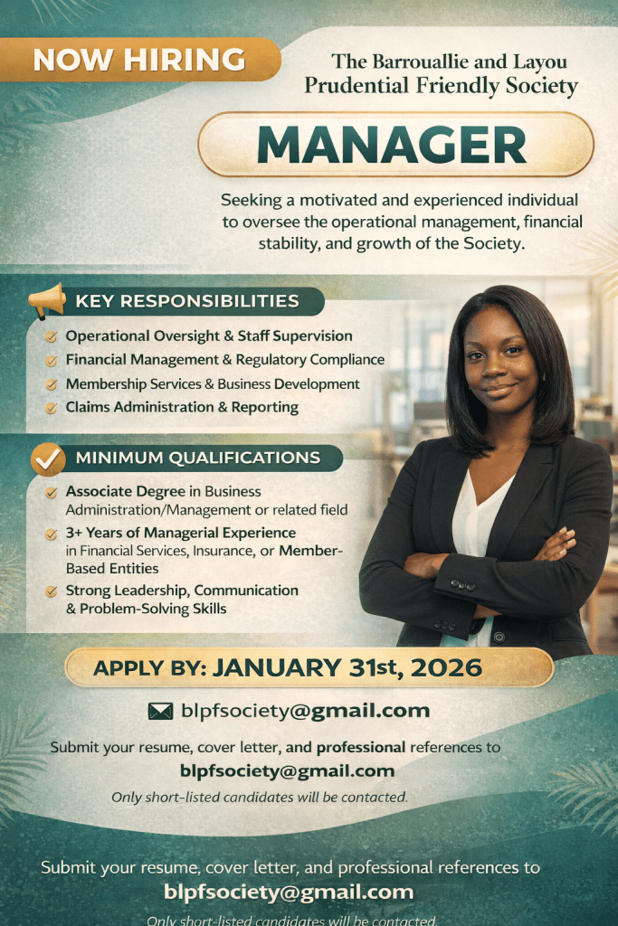 Interested persons should submit a cover letter, a detailed resume, documentation of academic qualifications and two (2) professional references to The President, Barrouallie and Layou Prudential Friendly Society (email: blpfsociety@gmail.com)