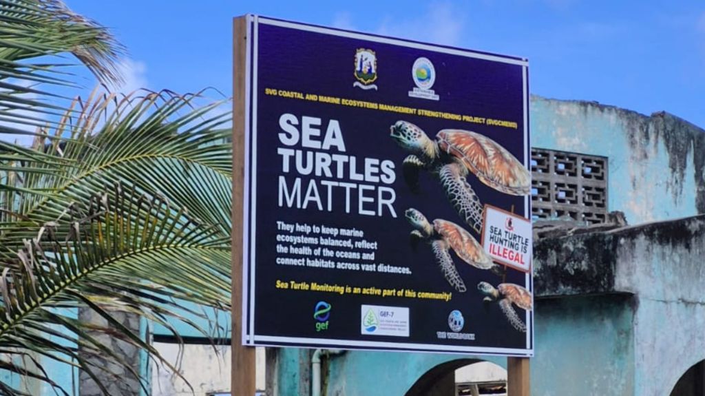 The sign, installed on April 1, 2026, forms part of ongoing initiatives under the St. Vincent and the Grenadines Coastal and Marine Ecosystems Management Strengthening Project (SVGCMEMS). It is intended to educate residents and visitors about the importance of protecting sea turtles and to highlight the negative impact of poaching on the country’s marine biodiversity.